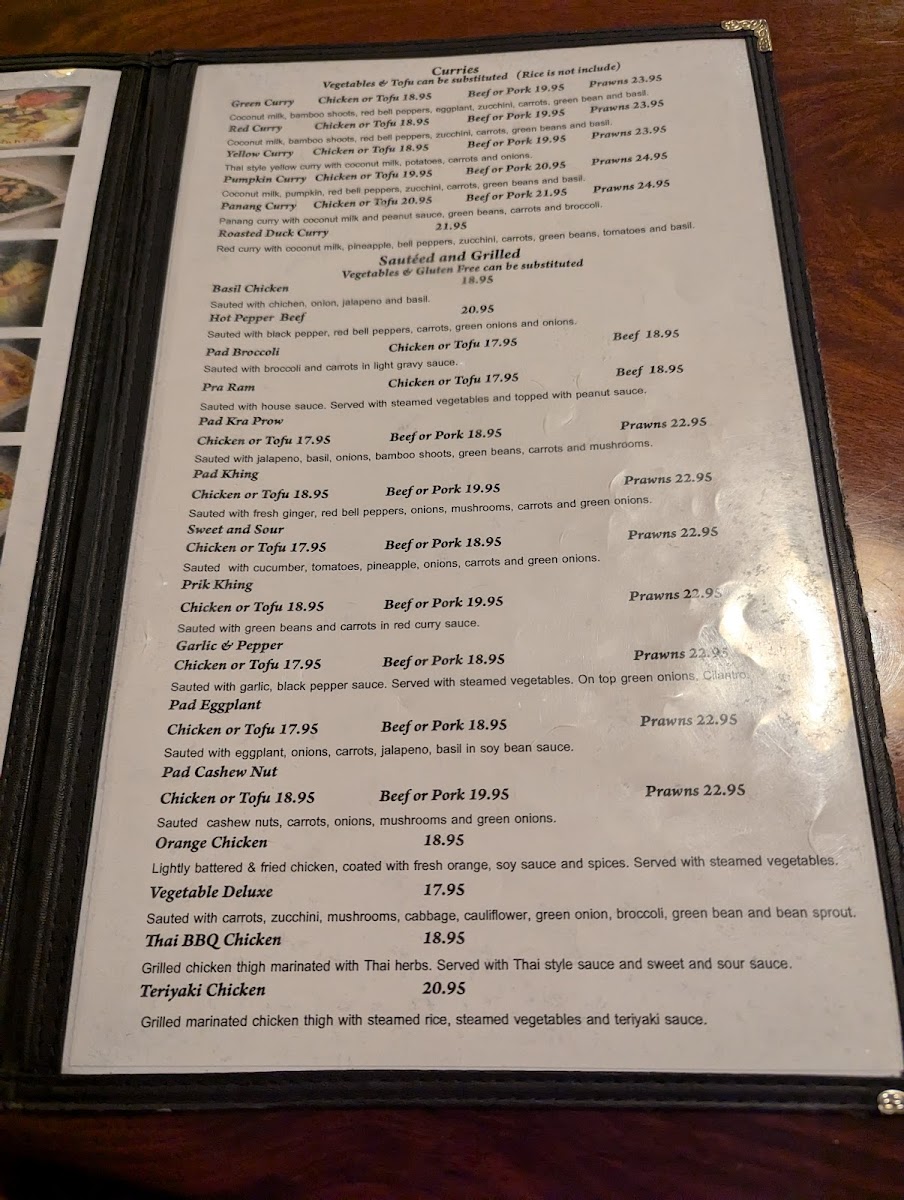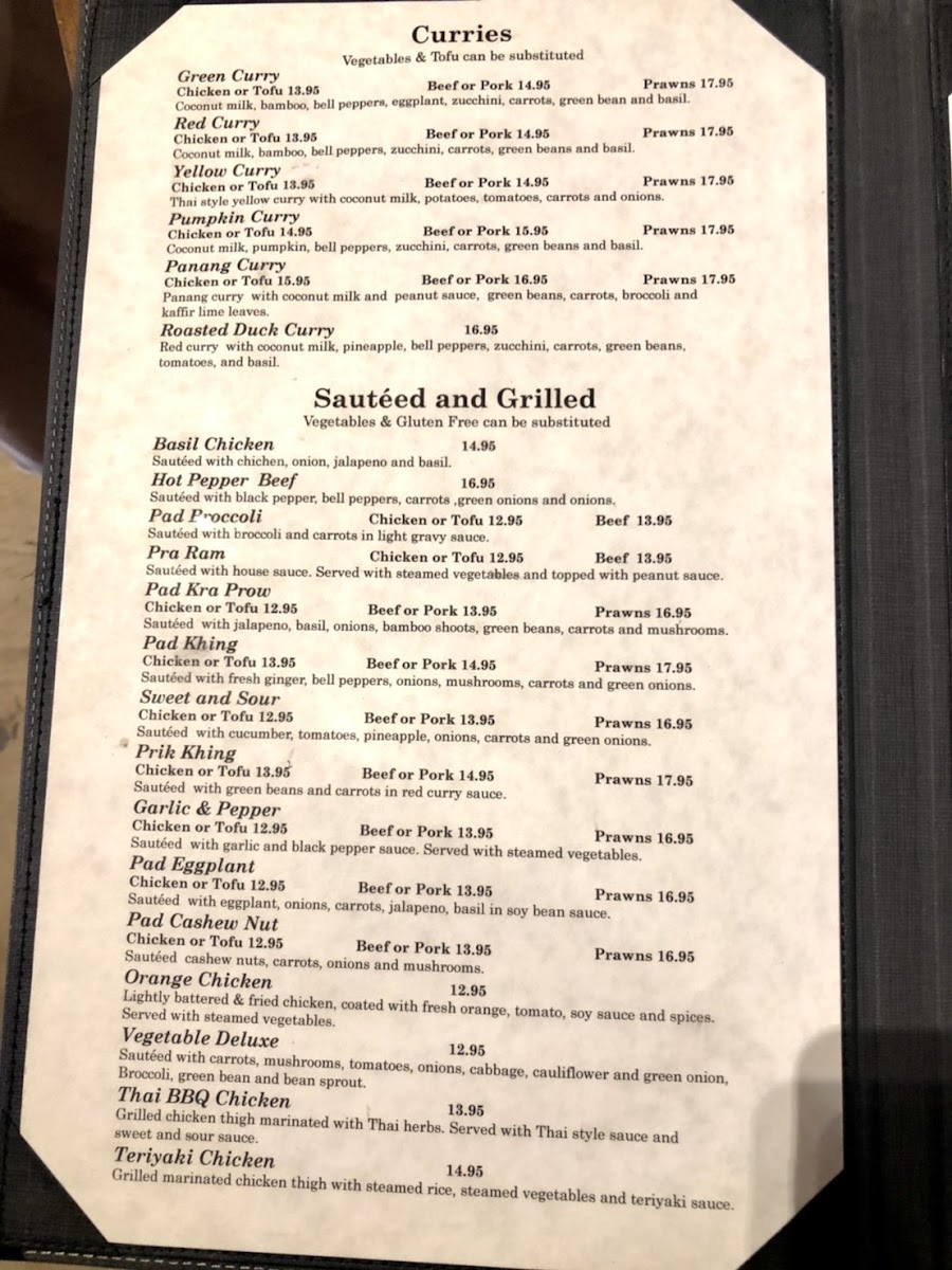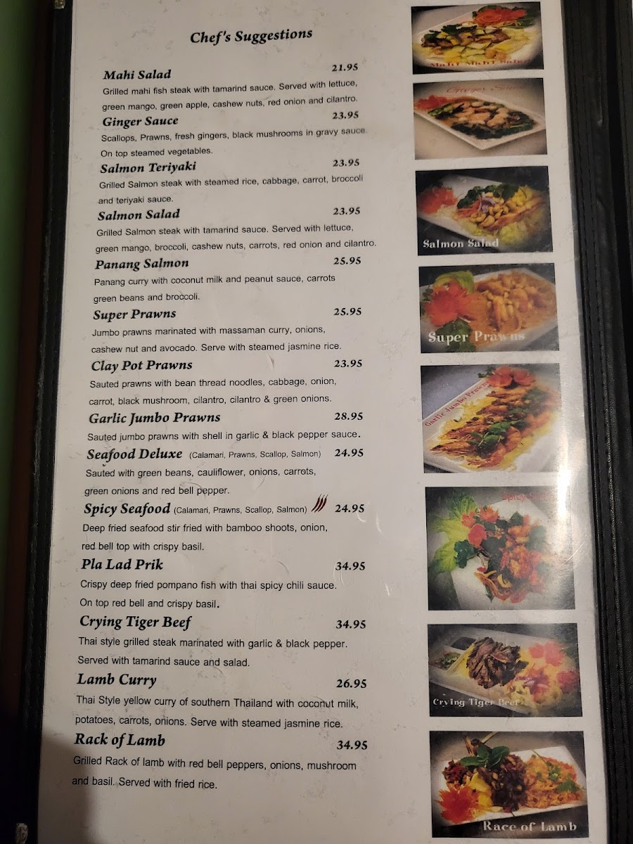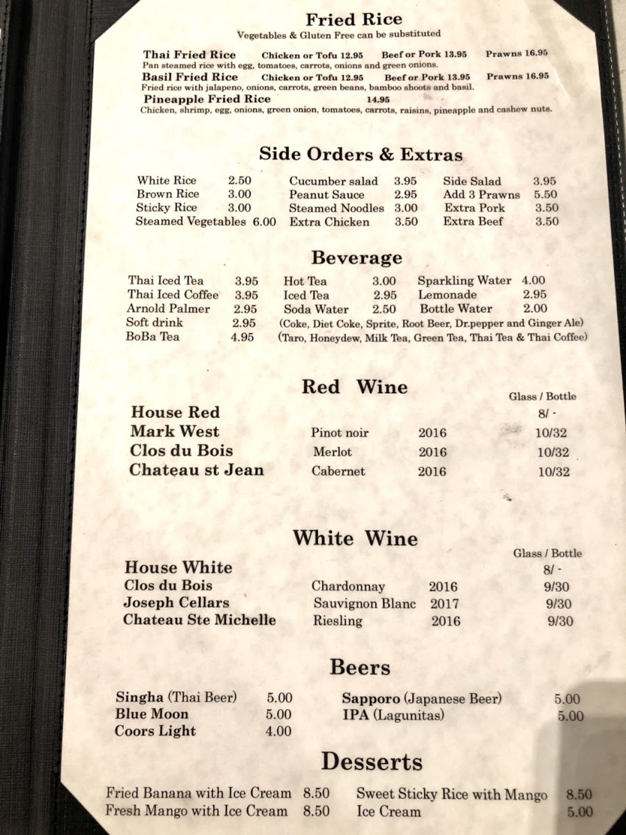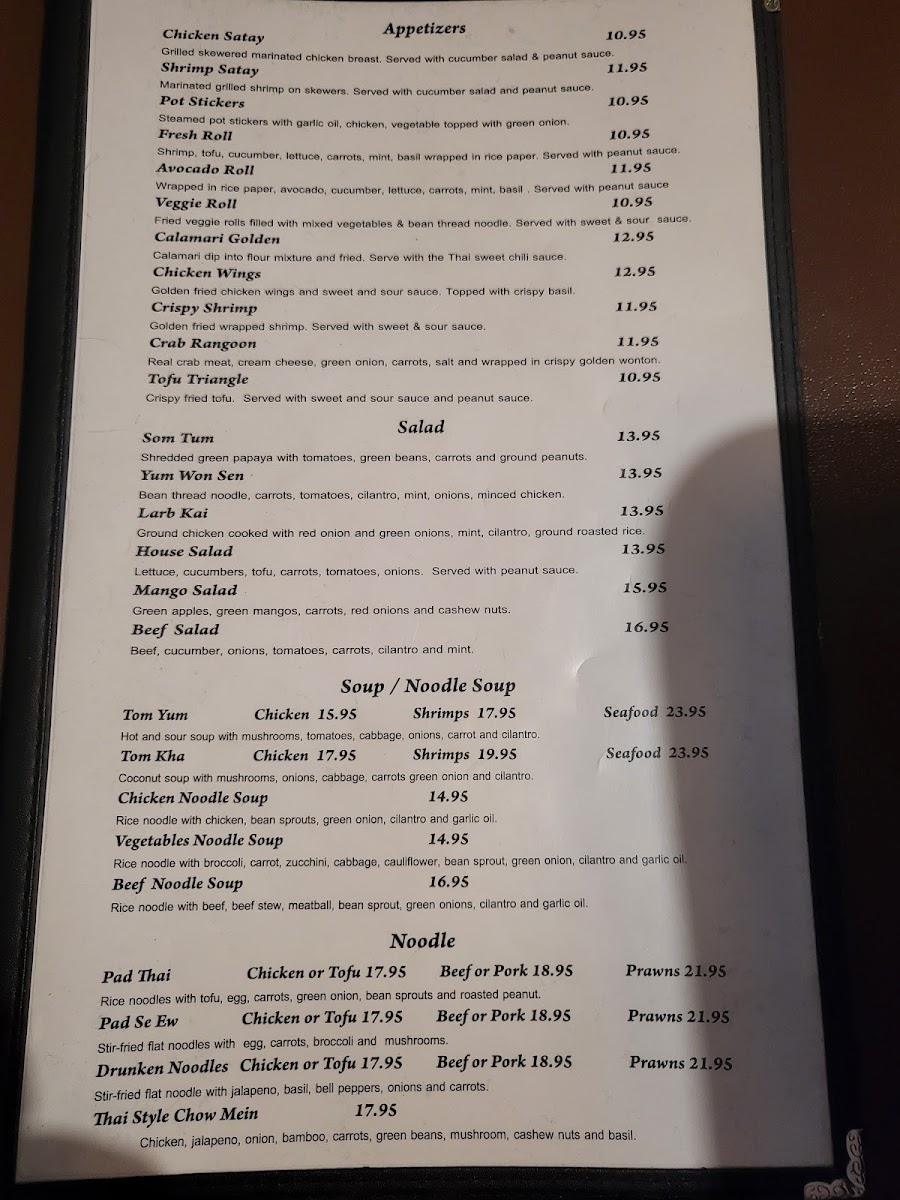 The menu pairs well with a laid-back dining experience, where the focus is on savoring each bite in a calm setting. Drinks like the classic Thai Iced Tea or a cool Singha beer complement the food nicely, adding to the enjoyment of a leisurely meal. Light appetizers such as Crab Rangoon or Calamari Golden invite sharing and casual conversation, while heartier entrées, including Drunken Noodles with Prawns or Yellow Curry with Rice, deliver satisfying warmth and balance.