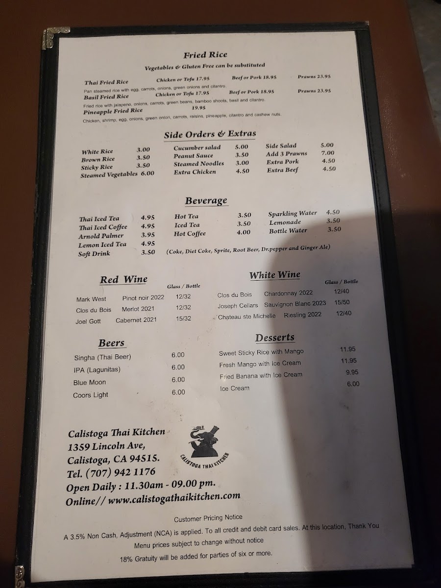 Calistoga Thai Kitchen Menu